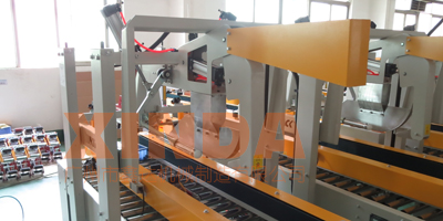 紙箱通過流水線輸送到折蓋封箱機(jī)處,折蓋封箱機(jī)自動(dòng)啟動(dòng)折蓋機(jī)構(gòu),然后對(duì)紙箱上蓋進(jìn)行折合并且同時(shí)進(jìn)行膠帶黏貼和輸送。