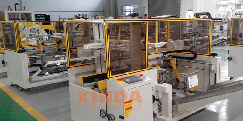成型紙箱板通過吸盆水平吸取,紙板打開,底部左右折蓋,隨后紙箱長(zhǎng)面折頁折合并同時(shí)進(jìn)行底部膠帶黏貼動(dòng)作,最后通過輸送口輸送出紙箱;