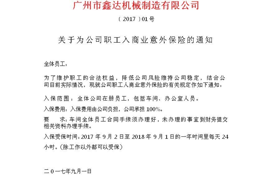 企業(yè)的發(fā)展離不開員工的勤奮和努力,員工的付出造就了企業(yè)的生命力和價(jià)值;為此鑫達(dá)機(jī)械制造有限公司為了給員工有一個(gè)更安心的保障,除了為員工按國家規(guī)定購買社保保障,更為員工購買了意外保險(xiǎn),為員工生命安全保駕護(hù)航。